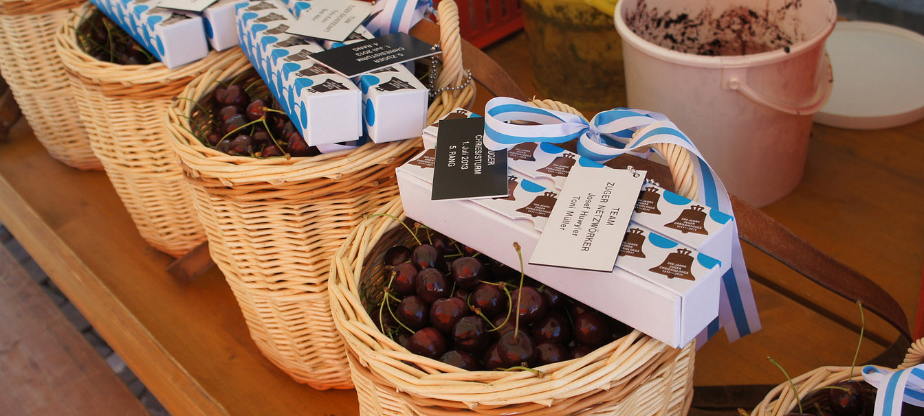 Seit fast 400 Jahren findet Mitte/Ende Juni der Zuger Chriesimärt statt. Hier kosten Sie die kirschroten Früchte und Spezialitäten der hiesigen Kirschenbauern.