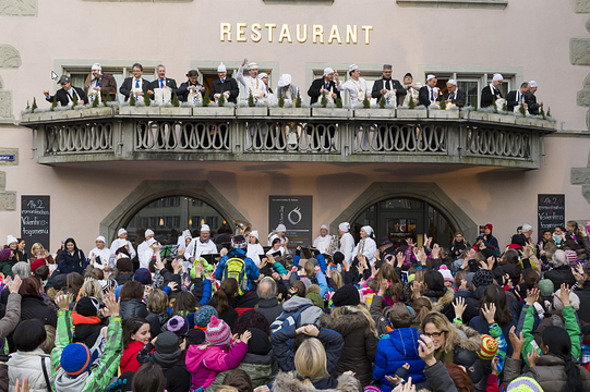 Und aus dem Fenster des Restaurants Aklin. Brötchen, Orangen, Würstchen und Konfekt fliegen durch die Luft. Schülerinnen und Schüler, Familien mit Kindern schreien lauthals «Backermöhli! Bäckermöhli!». Und fangen die Ware auf. Das Bäckermöhli findet immer am letzten Mittwoch im Januar statt.